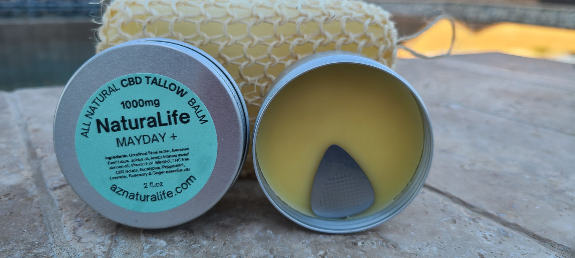 This balm is crafted with: shea butter, beeswax, beef tallow, jojoba oil, arnica-infused sweet almond oil, menthol crystals, vitamin E oil, and THC-free CBD isolate (1000 mg).